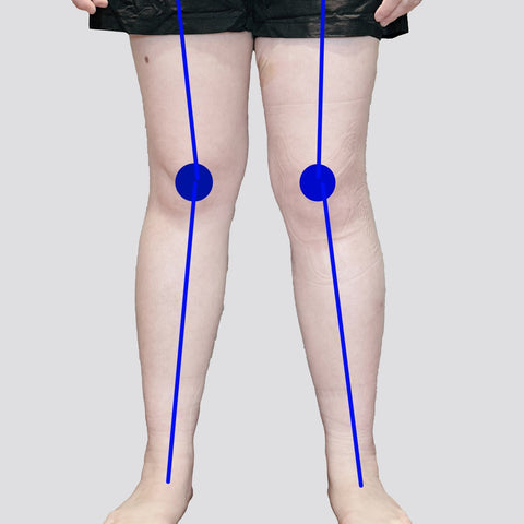 ※骨盤の理想的な角度である「やや前傾」の状態を維持するために必要な、臀筋、腸腰筋の筋力が弱いため、骨盤の前傾が強くなり、X脚が進行。