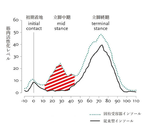 歩行時の長腓骨筋の活性化レベルを測定した研究では、固有受容器インソールを着用した時の方が、従来型インソールを着用した時よりも立脚中期に筋活動がより大きく活性化されることが証明されています。