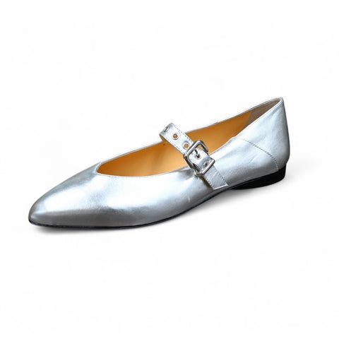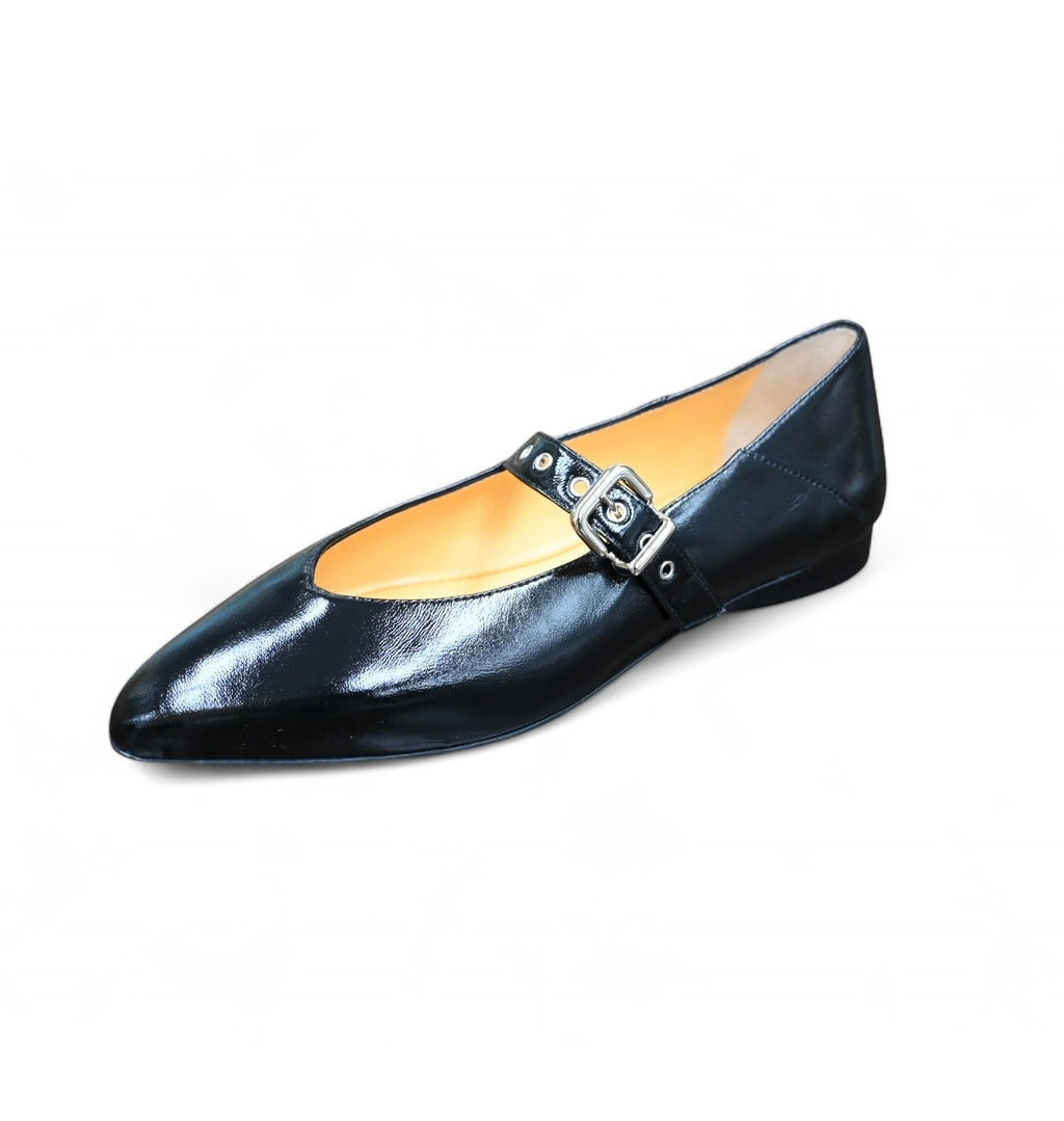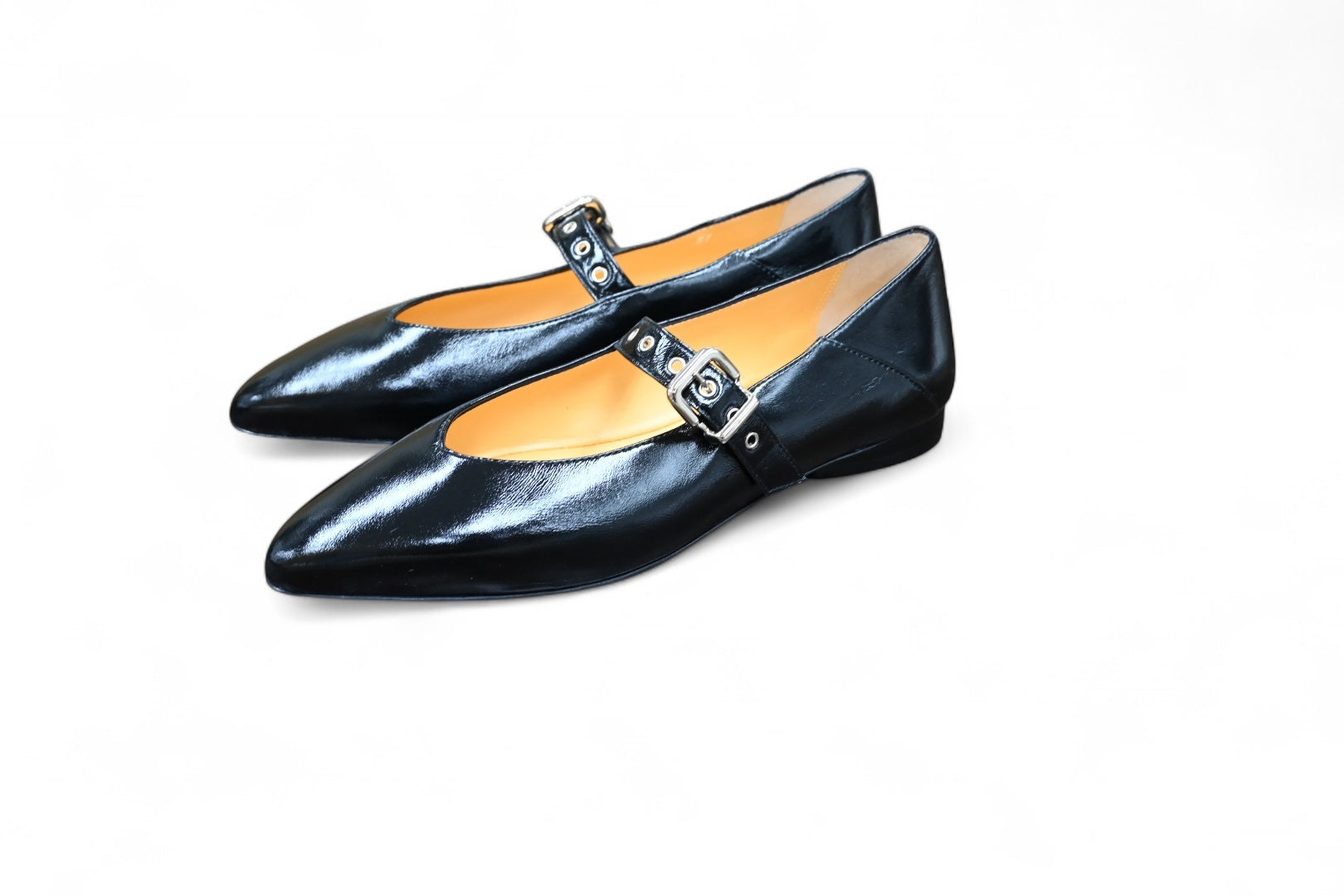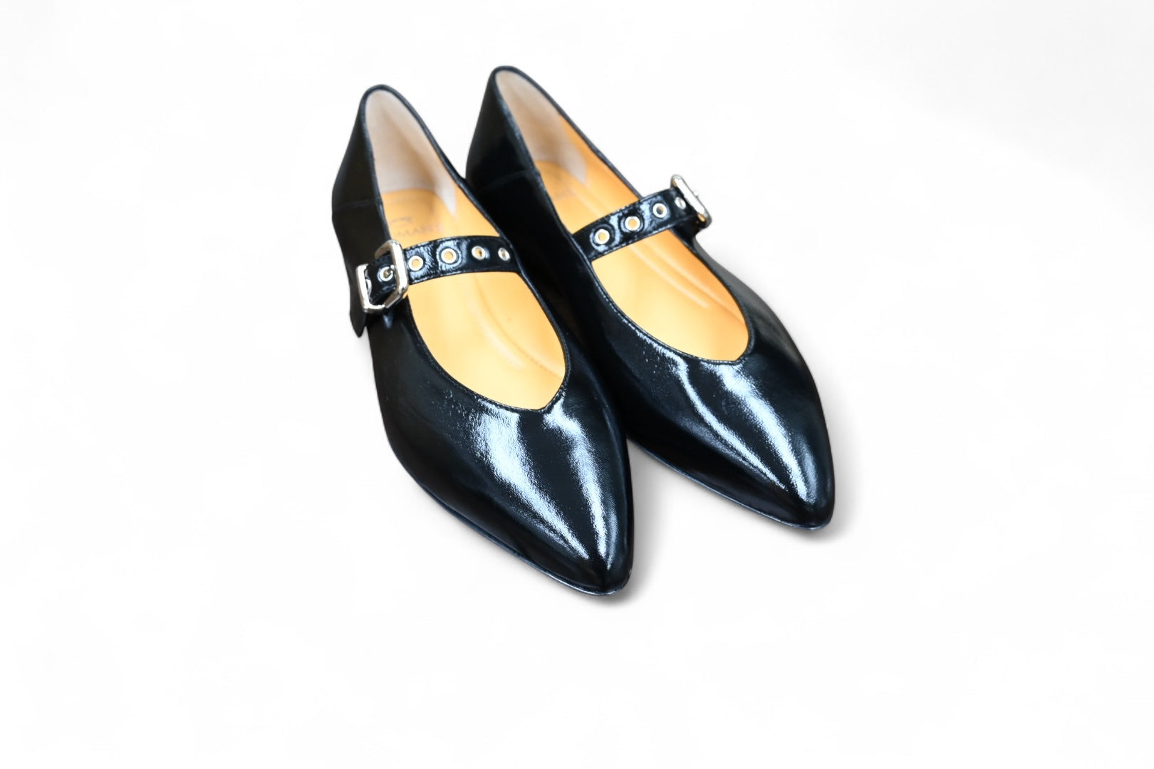 ポインテッドトウですが、ヒール高1cmで緩みがロングノーズで指先の圧迫は全くありません。ツボラーレ製法というアッパーと中底が一体化するため、足裏の返りが非常によくなり、歩きやすくなります。 ソフトエナメルレザーなので、履き心地は柔らかいです。
