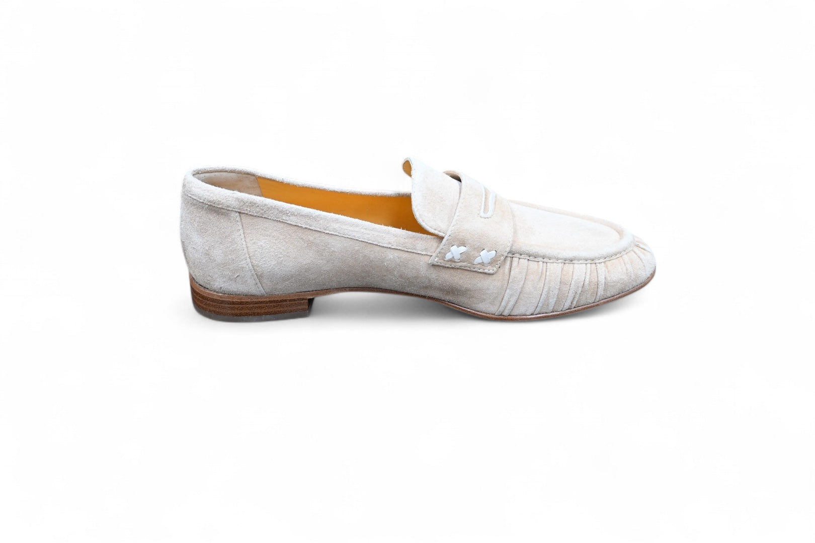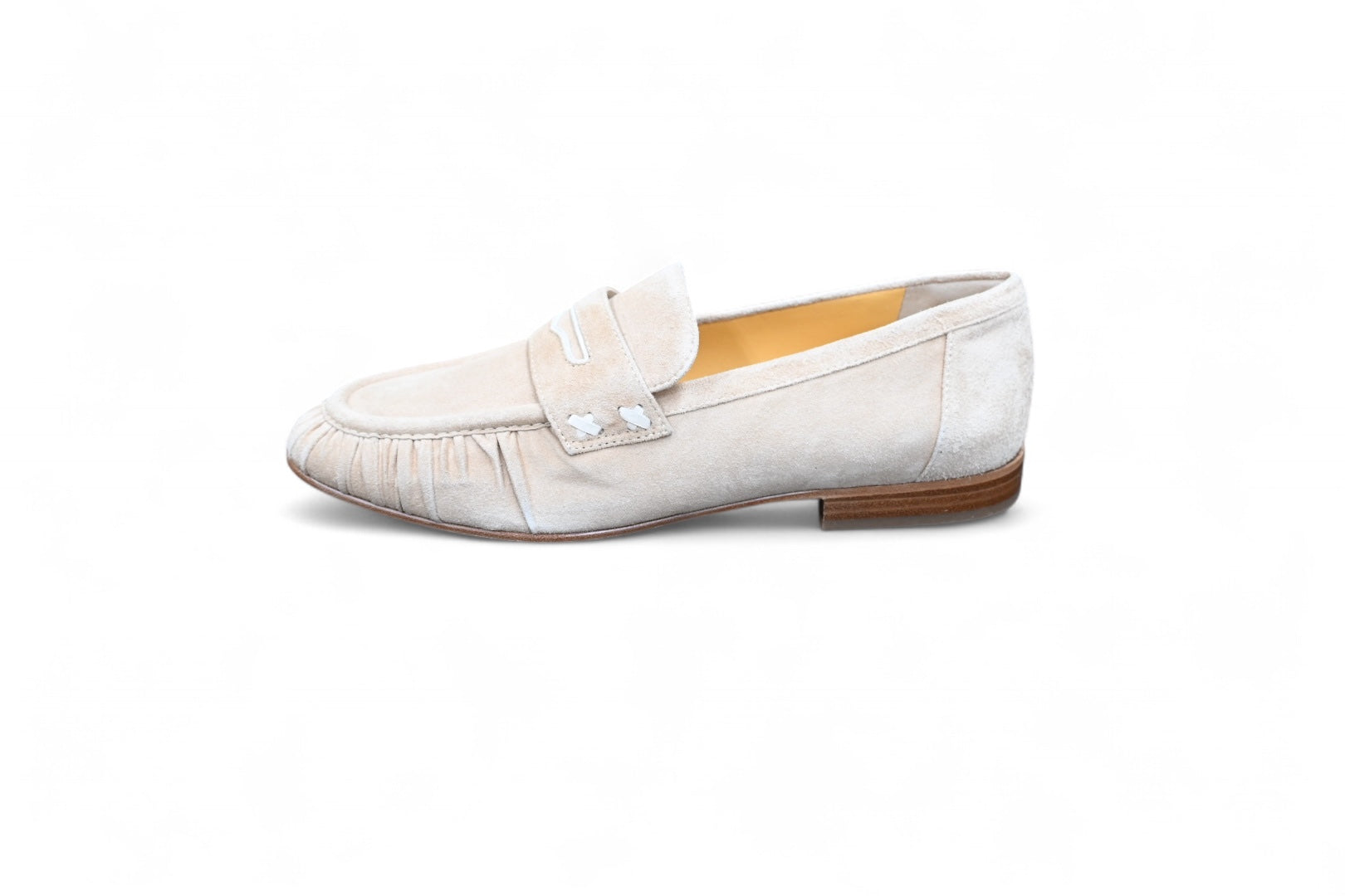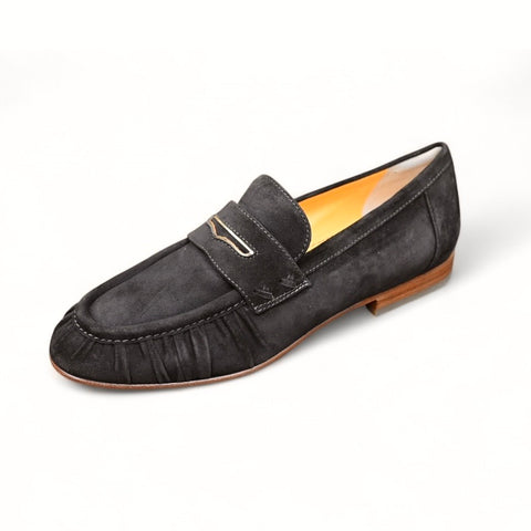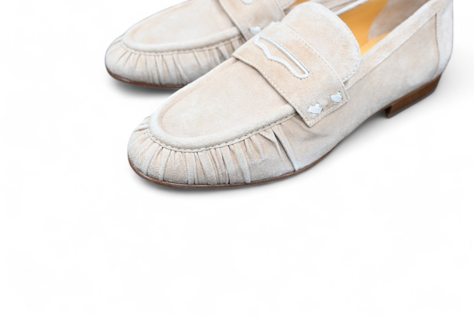 シャーリングが美しいローファーです。ロングノーズで指先にはゆとりがあり細身の木型でフィット感が良いです。ラバーソールなので履き心地はソフトです。